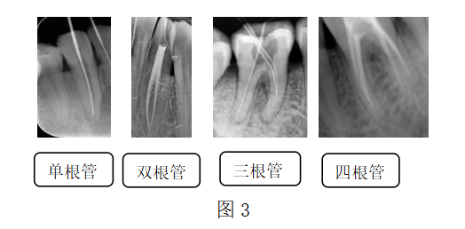 在进行根管治疗时,患牙自身状况可直接影响根管治疗难度:①牙齿位置越靠近咽喉部,治疗难度越大,第三磨牙的根管治疗难度大于前牙(图1);②牙齿越长,根管治疗难度越大(图2);③根管数目越多,根管治疗难度越大,如四个根管的的患牙,根管治疗难度大于单根管患牙(图3);④牙齿髓腔内或根管内存在钙化物、牙齿形态异常、根管弯曲度较大、根尖孔直径较大、存在牙髓治疗史或需要进行根管外科手术等,皆会增加根管治疗的难度。因此,对患牙情况进行评估,可分别将根管治疗难度分为1-4级(见表3)。